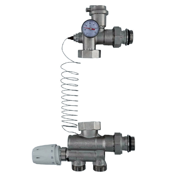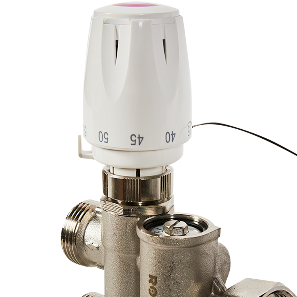 Насосно-смесительный узел ROMMER с термостатической головкой с выносным датчиком - изделие полной заводской готовности. Предназначен для создания в системе отопления здания циркуляционного контура с пониженной до настроечного значения температурой теплоносителя, поддержания температуры и расхода теплоносителя на заданном уровне, обеспечения гидравлической балансировки высокотемпературного и низкотемпературного контуров. Узел применяется в системах встроенного водяного отопления — теплые полы, теплые стены, обогрев теплиц и открытых площадок.