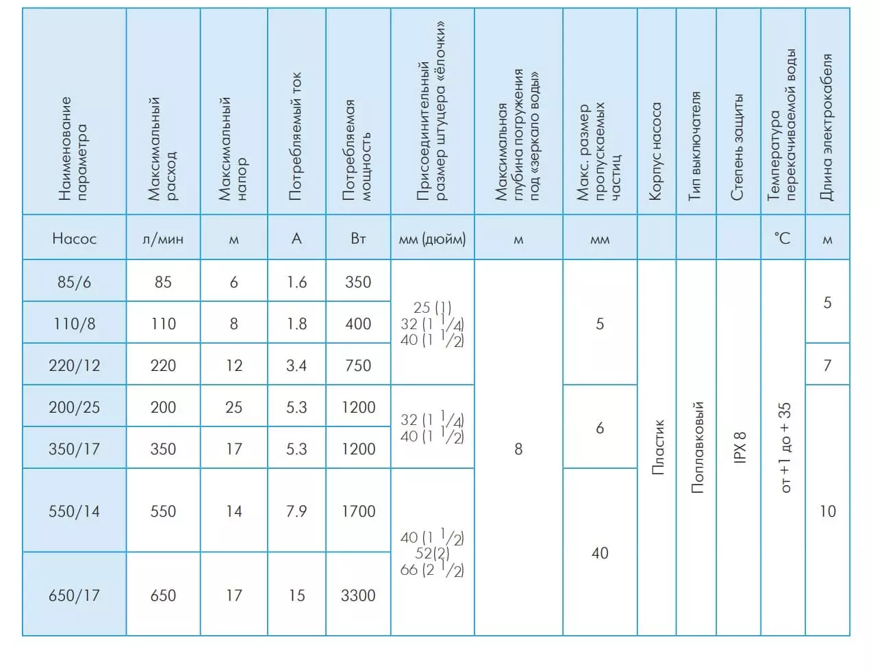 - Максимальная глубина погружения насоса не более 8 м под зеркало воды;