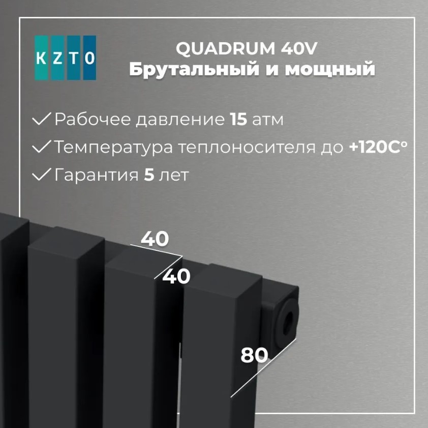 Радиатор Quadrum 40 V предназначен для однотрубных и двухтрубных систем отопления сухих помещений жилых, общественных и производственных зданий. Конструкция представляет собой два коллектора, соединенных межу собой квадратными трубами (40х40 мм).